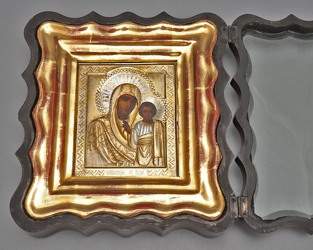 Небольшая старинная деревянная Казанская икона Божией Матери в серебряном окладе, 84 пр., Россия, 19 в.