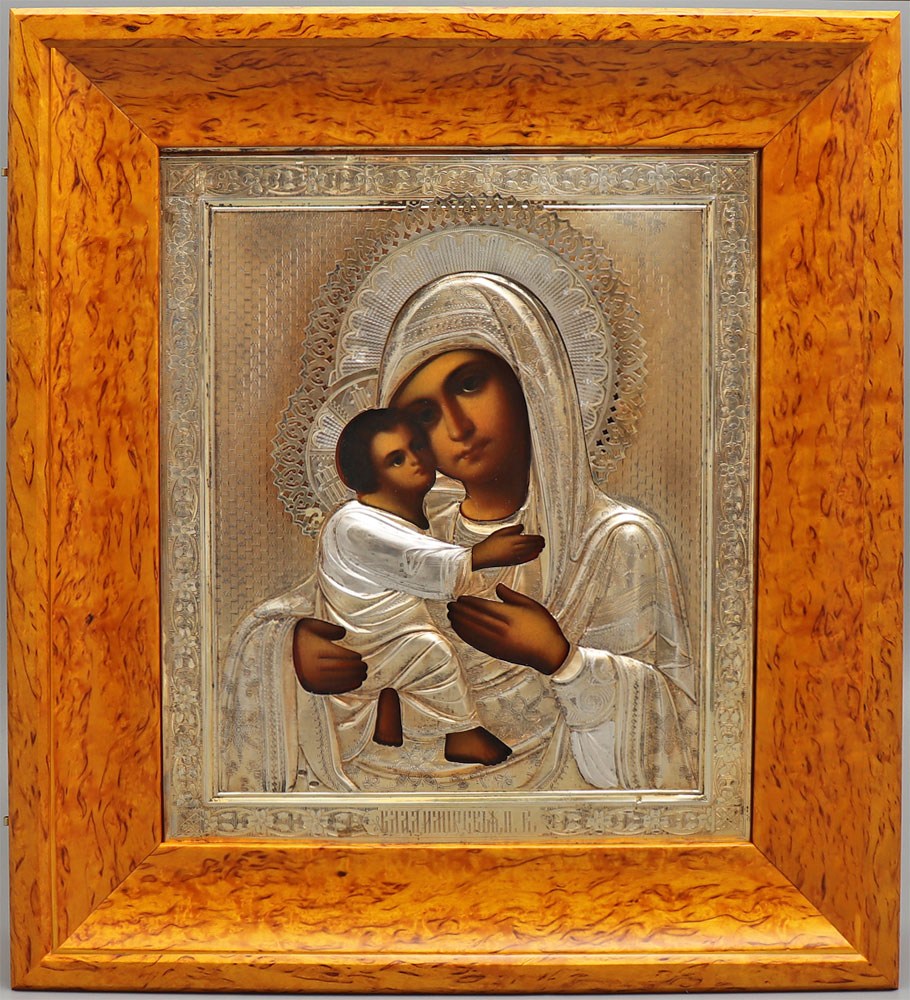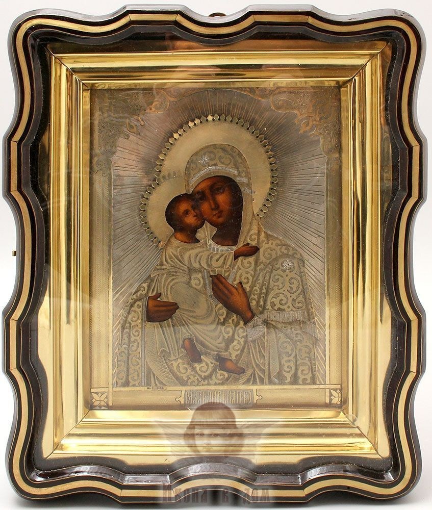 Антикварная икона в серебряном окладе и киоте «Божия Матерь Владимирская», Россия, Москва, 1868 г.