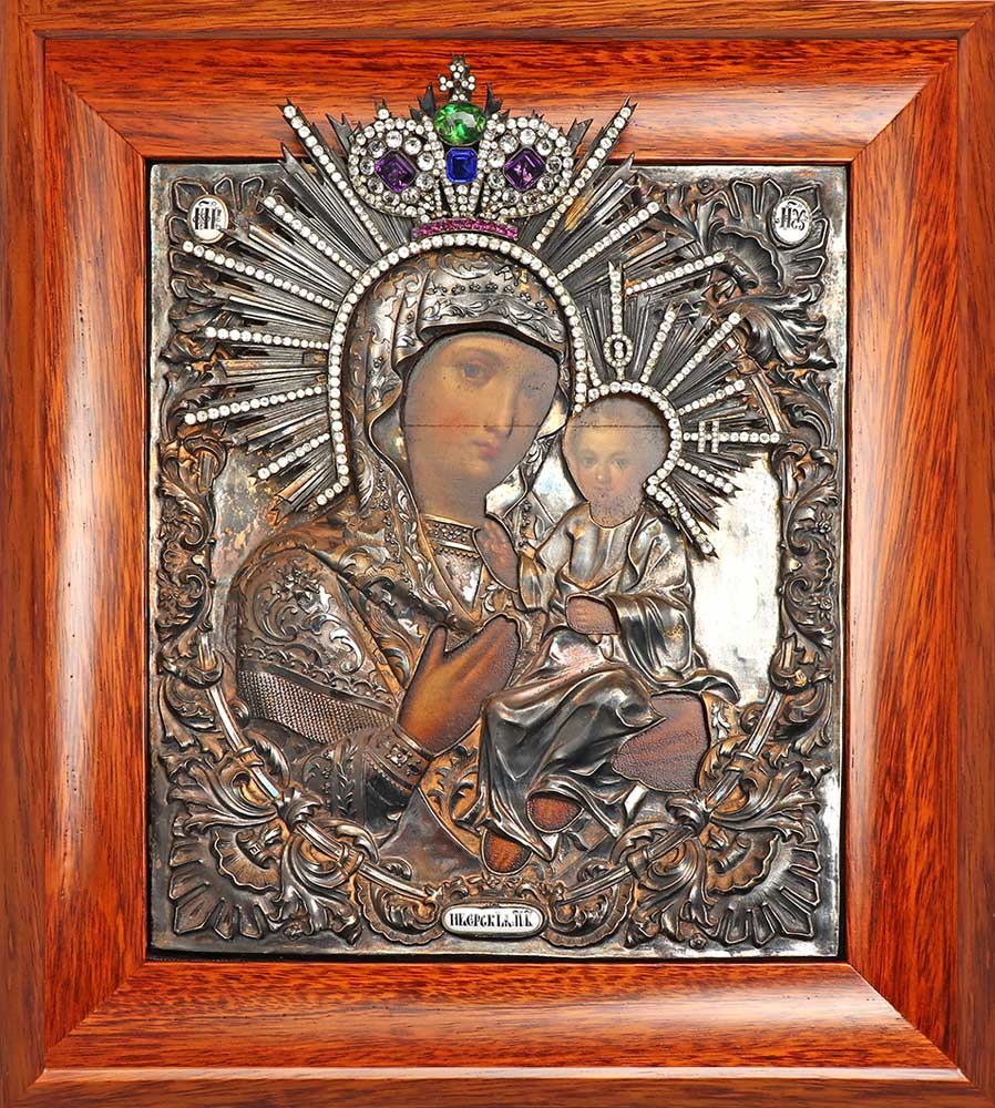 Древнерусская икона «Богородица Иверская» в серебряном окладе и киоте, Москва, 1840-е